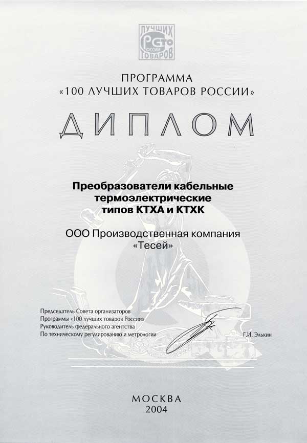 Победитель Всероссийского конкурса "100 лучших товаров России - 2004". На конкурс в номинации "Продукция производственно-технического назначения" были представлены кабельные термоэлектрические преобразователи типов КТХА и КТХК.