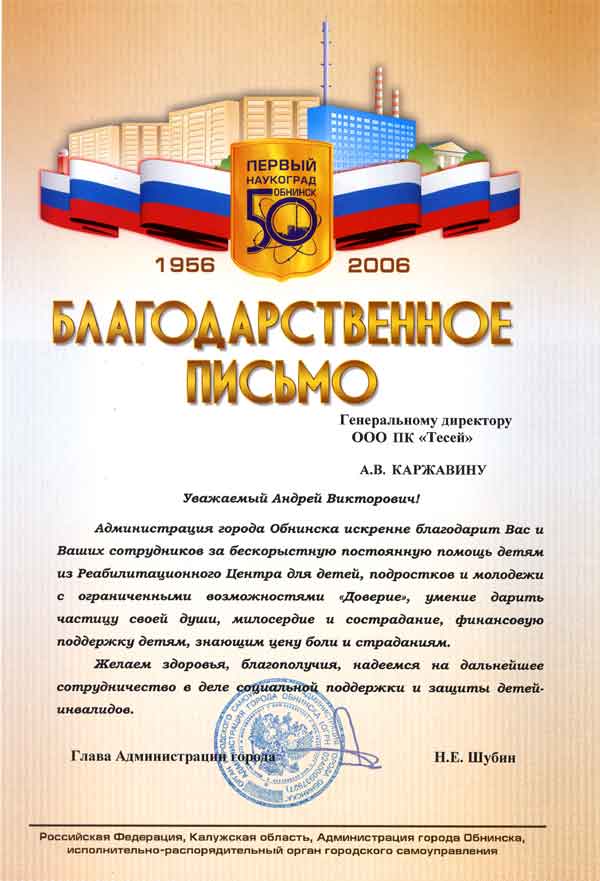 Благодарственное письмо Администрации г. Обнинска, 2006 г.