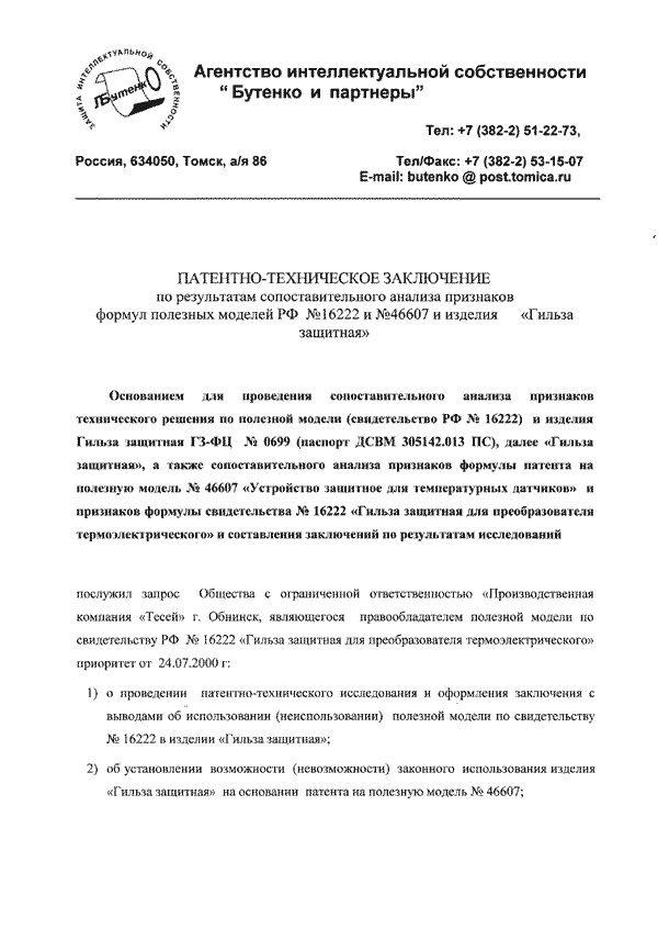 Патентно-техническое заключение по результатам сопоставительного анализа признаков формул полезных моделей фланцевых защитных гильз производства ПК "Тесей" и ООО НПО "Вакууммаш"