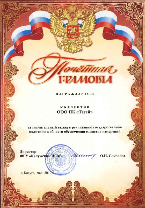 Почетная грамота ЦСМ Министерства экономического развития Калужской области, 2010 г.