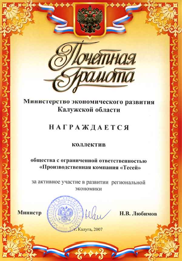 Почетная грамота Министерства экономического развития Калужской области, 2007 г.